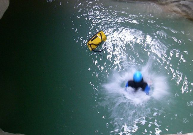 Maillot de bain, chaussures de sport pour marcher sur les rochers et dans l’eau (pas de chaussures d’eau qui ne maintiennent pas les chevilles !), chaussettes pour éviter les frottements, serviette, rechange.