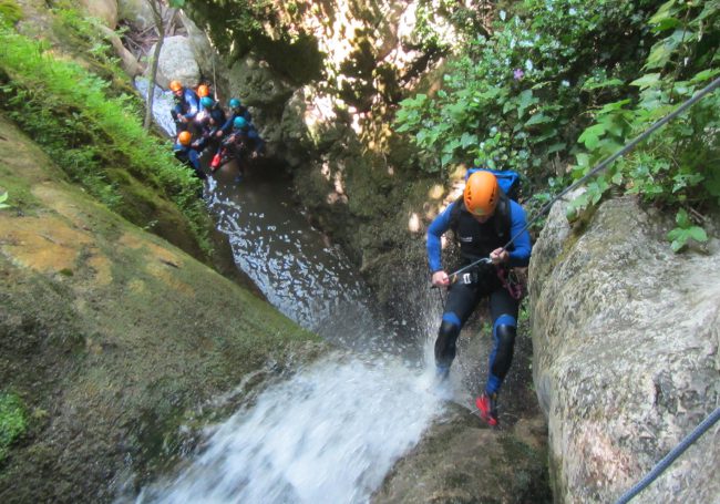 Equipés directement en tenue intégrale de canyoning à notre base, vous partez ensuite en navette gratuite avec votre guide pour 4 km de route. Une marche de réveil…, un peu escarpée et un peu vertigineuse, passant sous la cascade de Courmes dans un chemin taillé la roche conduira le groupe en 30 mn au départ du canyon de Bès-Courmes. Quelques explications techniques sur les descentes en rappel vous seront données par votre guide avant d’entamer le premier de 8 mètres puis celui de 13 mètres dans une ambiance de canyon très étroit avec une belle marmite suspendue.
