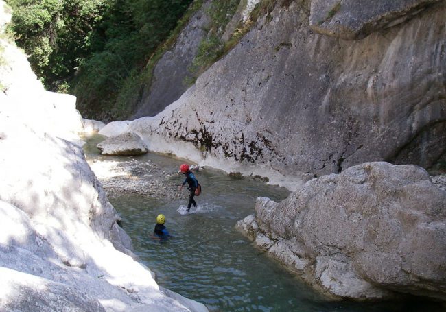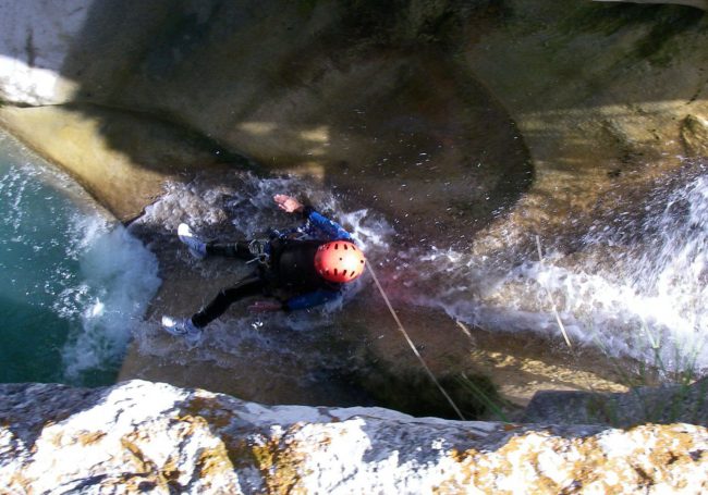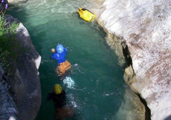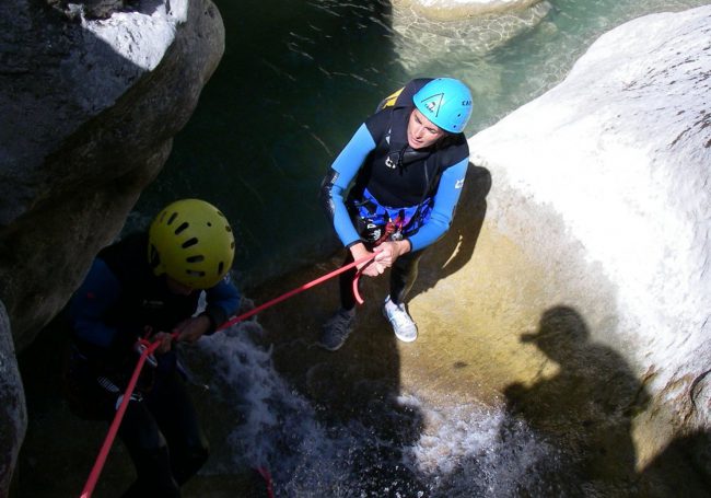 Initiation course in which alternate easy abseiling, progression and jumps into natural pools.